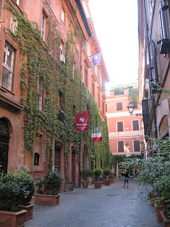 The center of Rome, where we stayed, is full of tourists but also filled with really high-end big-name designer stores, the names of which always escape me---that fashion shit goes in one ear and out the other, with me. I remember a store filled with purses costing thousands of dollars----that kind of silliness. But mixed in with that, down the side streets, are ordinary stores selling ordinary things to the people who live in the area. We found a grocery store we visited a couple of times, so we could stock up on water, cheap wine, and stuff to gnosh on.